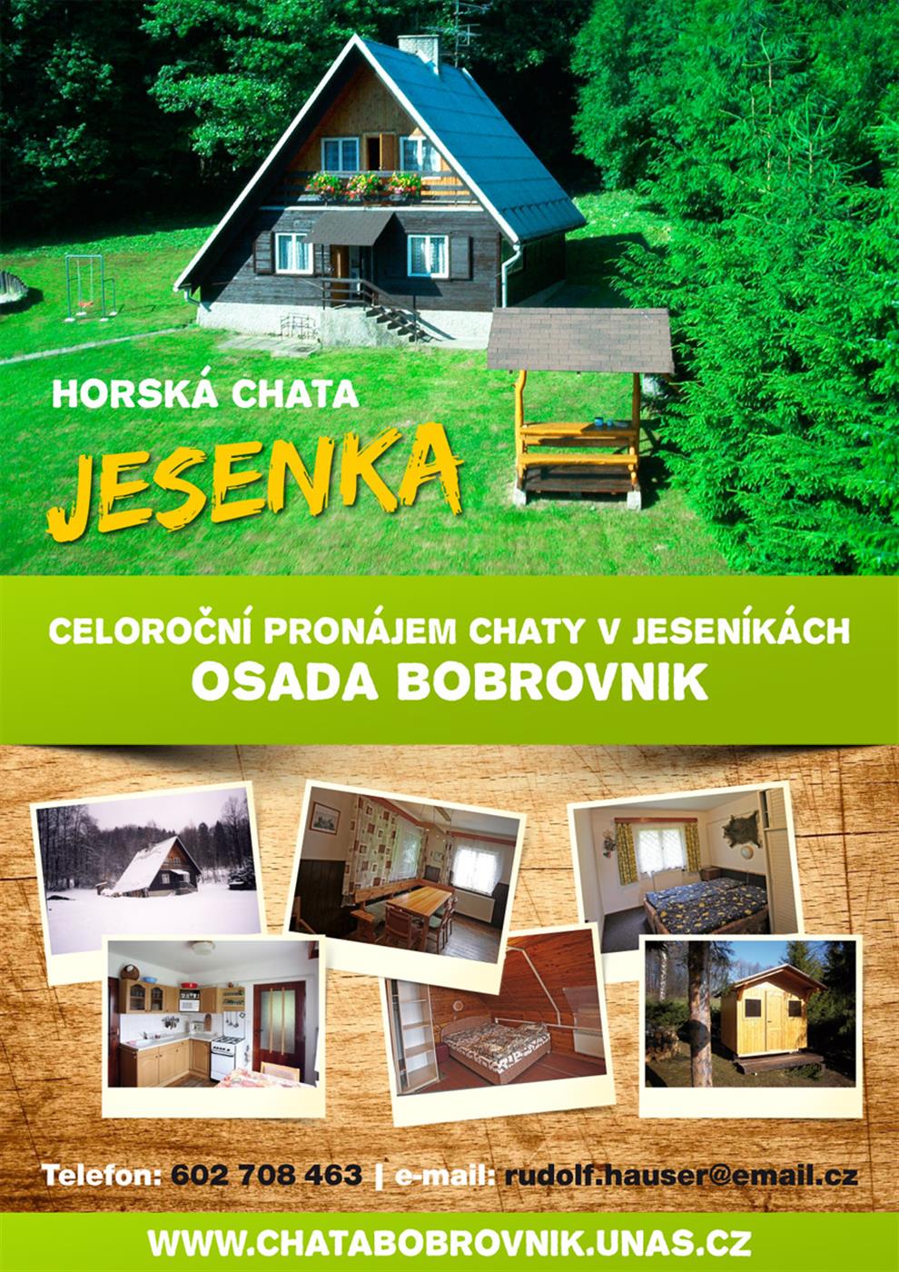 V přízemí kompletně vybavená kuchyňská linka se sporákem a vybavením, mikrovlnou troubou a varnou konvicí, jeden dvoulůžkový pokoj a koupelna s umyvadlem, sprchovým koutem a WC. Na druhé straně vstupu je společenský pokoj s jídelním koutem ,se sedací soupravou, krbovými kamny a BTV s DVDpřehrávačem. V podkroví je velký pokoj s 5 lůžky s terasou a vyhlídkou na Lázně Jeseník, Studniční vrch, rozhlednu na Zlatý Chlum. Naproti tomuto pokoji je dvoulůžkový pokoj. Součástí chaty je na pozemku postavena nová víceůčelová chatka pro 2 až 4 osoby. Pokud si děti budou chtít hrát nebo spát v táborové chatě , nemusí spát pod stanem, ale napalandách na matracích v chatce. Naopak se tím i zvětšuje možnost a kapacita ubytovaných v letním období a možnosti i zábava a vyžití dětí. Trampolína o průměru á 4 metry pro děti. Chatka se dá použít i jako bezpečné uložení jízdních kol pro ubytované cykloturisty. K dispozici wi-fi připojení.Nákup základních potravin je možný v Lázních Lipová nebo ve městě Koupání je jednak na koupališti v Jeseníku, jednak od chaty je přírodní koupaliště cca 300 m.