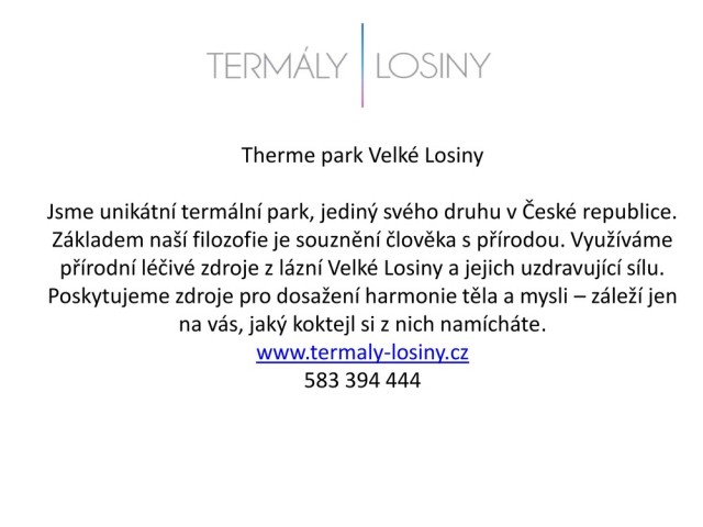 Turistické informační centrumLázeňská 674, 788 15 Velké Losinye-mail: infolosiny@losiny.czwww: www.iclosiny.czwww.losiny.cztel.: 583 248 248